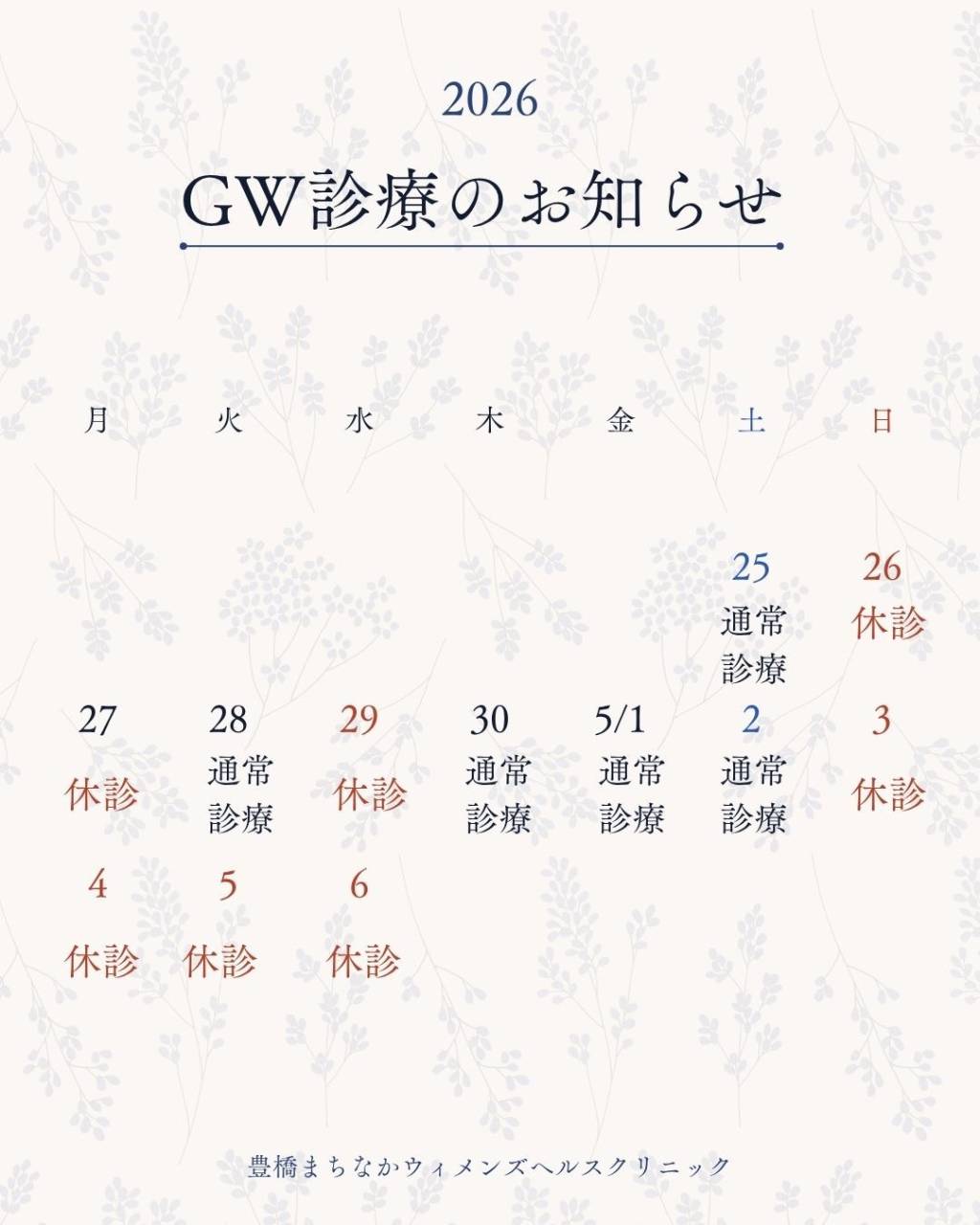 2026年ゴールデンウィーク中の診療のお知らせ 2026/04/15 《2026GWのご案内》 豊橋まちなかウィメンズヘルスクリニックです GW診療のご案内です 通常と変わらず診療させていただきます 連休前後は混み合いますので、お薬が必要な方は早めの予約をお願いいたします ご不便をおかけしますがよろしくお願いいたします お知らせ